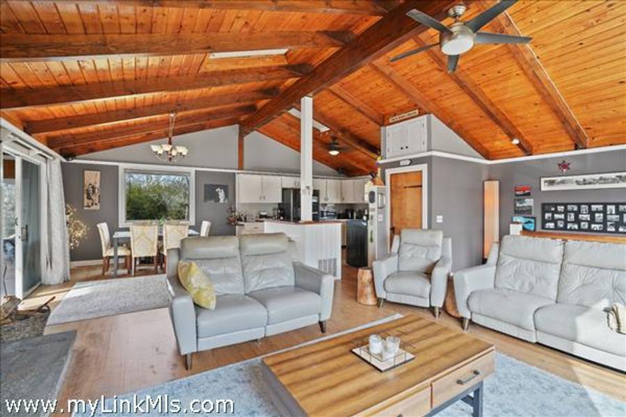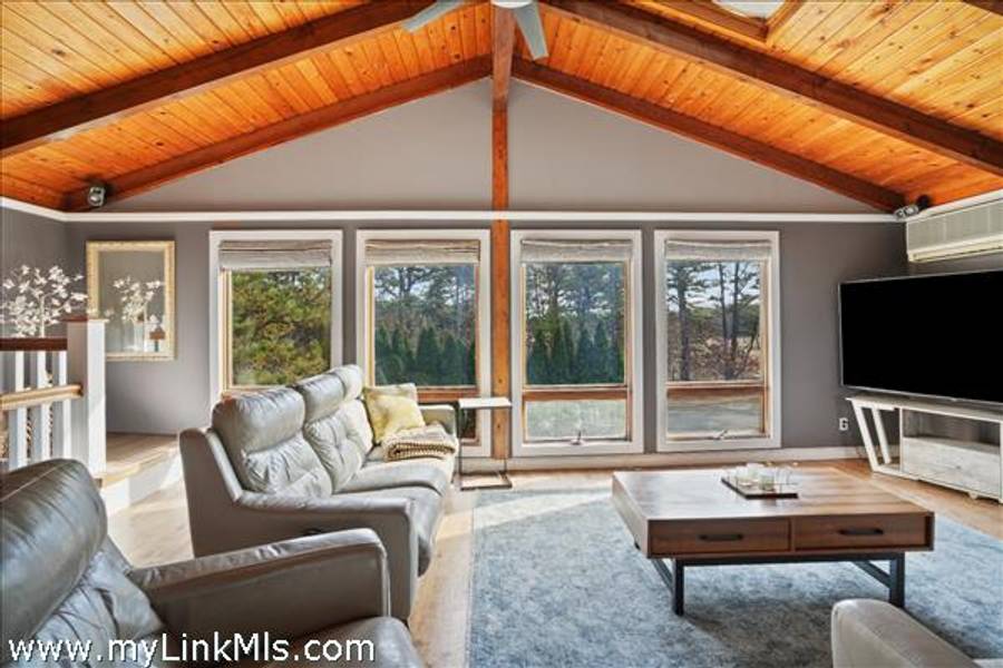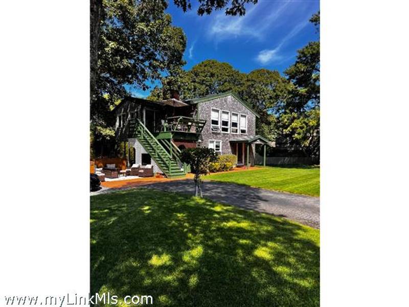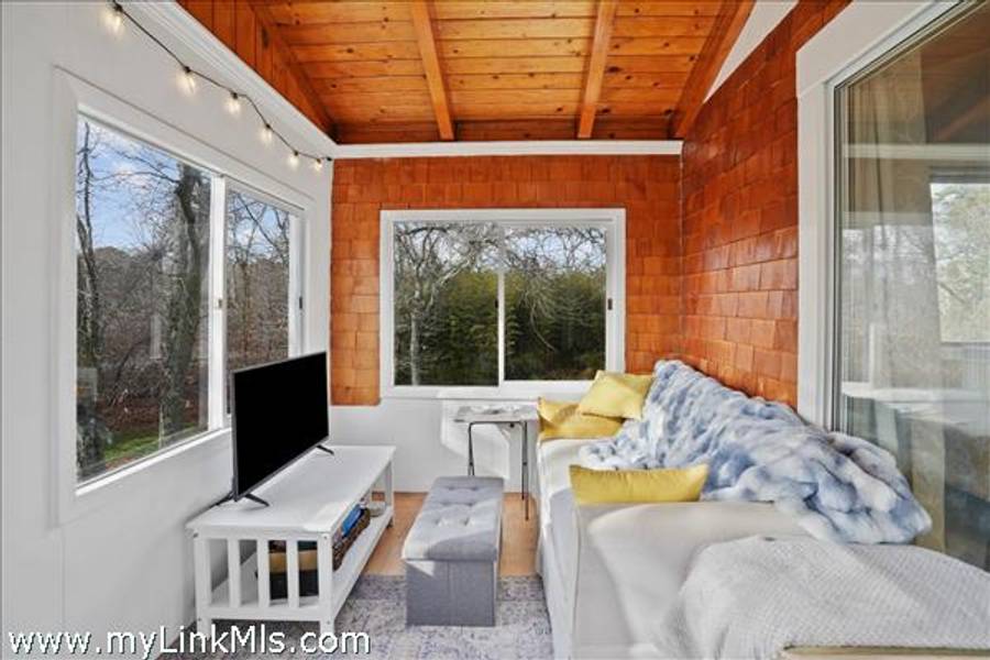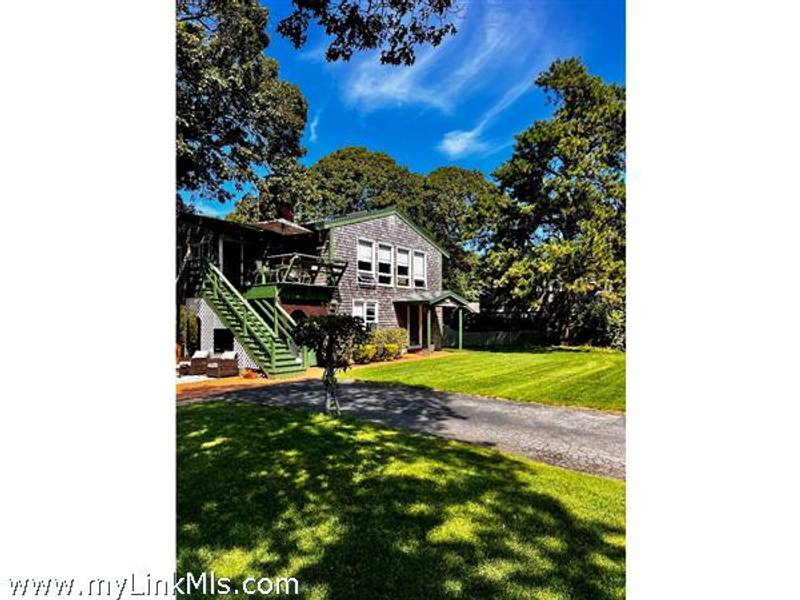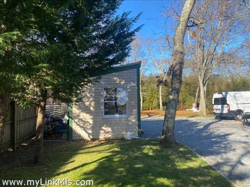 Set on just over half an acre near downtown Oak Bluffs abutting permanently preserved acres by Land Bank - a rare find in central Oak Bluffs! This home blends classic Midcentury architectural character with abundant natural light from floor-to-ceiling windows and soaring post-and-beam ceilings creating a warm and inviting space. The interior features hardwood floors in the dramatic great room highlighted by an impressive wall of windows that fills the space with sunlight and frames serene views of protected pastoral land. The open-concept kitchen, dining, and living areas are anchored by a striking fireplace, creating an inviting setting for gatherings. Just off the kitchen, a charming, screened porch offers a cozy three-season retreat, perfect for morning coffee or evening relaxation. The main level includes three generous bedrooms and a full bath. while the walk-out basement provides a workshop area with sink and storage room. Outside, the property is thoughtfully landscaped with irrigation with mature rows of Arborvitae trees, giving it a private, park-like feel. A back patio and a detached office offer additional spaces to work, unwind, or take in the peaceful surroundings. Conveniently located, this property is within walking distance of the Oak Bluffs School, the Tradewinds walking trail just across the street, bike paths, and public transit. Downtown Oak Bluffs and the beach are only minutes away- an ideal combination of privacy, convenience, and potential. This lot could provide potential options for future enhancements such as expanded living space, a garage, guest house/ADU… Building possibilities should be explored and reviewed in accordance with town bylaws. Note: The property is being sold as-is, and the buyer will be responsible for replacing the existing septic system.