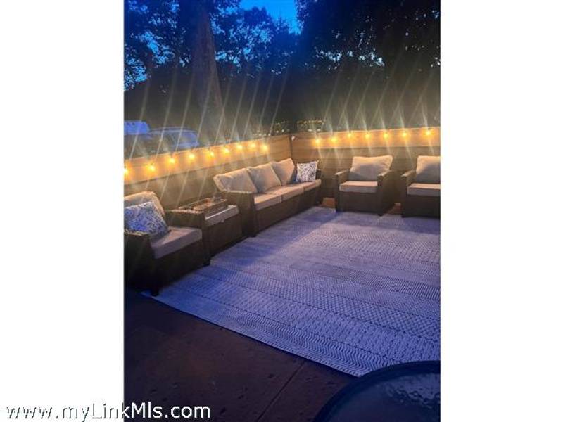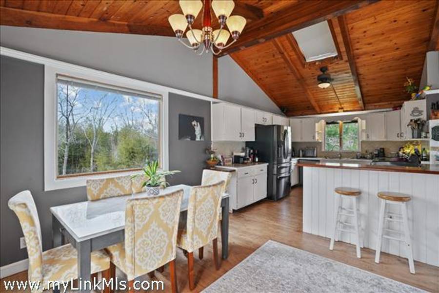 Open concept kitchen and dining lead to an enclosed porch with stairs to patio and back yard