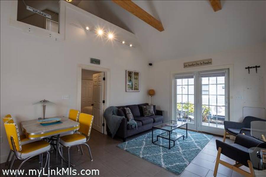 The DETACHED REAR COTTAGE offers approximately 600 square feet of living space, with high vaulted ceilings, exposed wood beams, and an abundance of natural light throughout the open living and dining areas. The kitchen features granite countertops, a glass tile backsplash, and stainless steel appliances. Additional highlights include a roomy loft area, full size washer/dryer in unit laundry, and a bluestone patio surrounded by beautiful landscaping. An outdoor shower completes this charming and efficient year-round retreat.