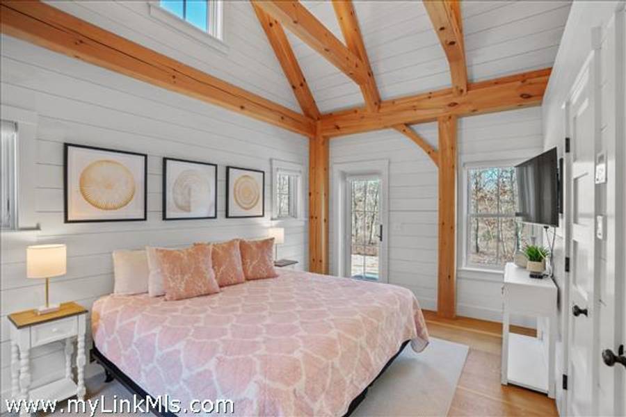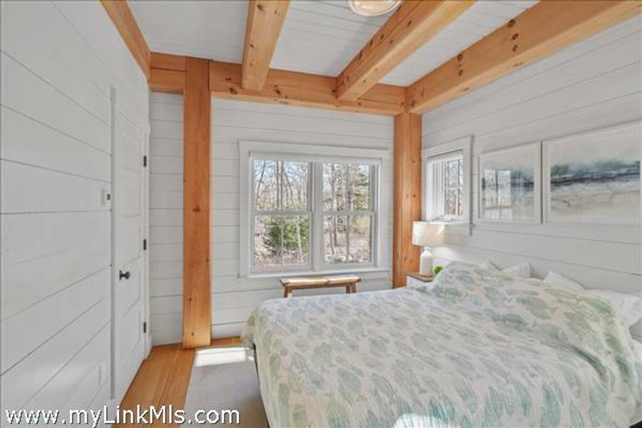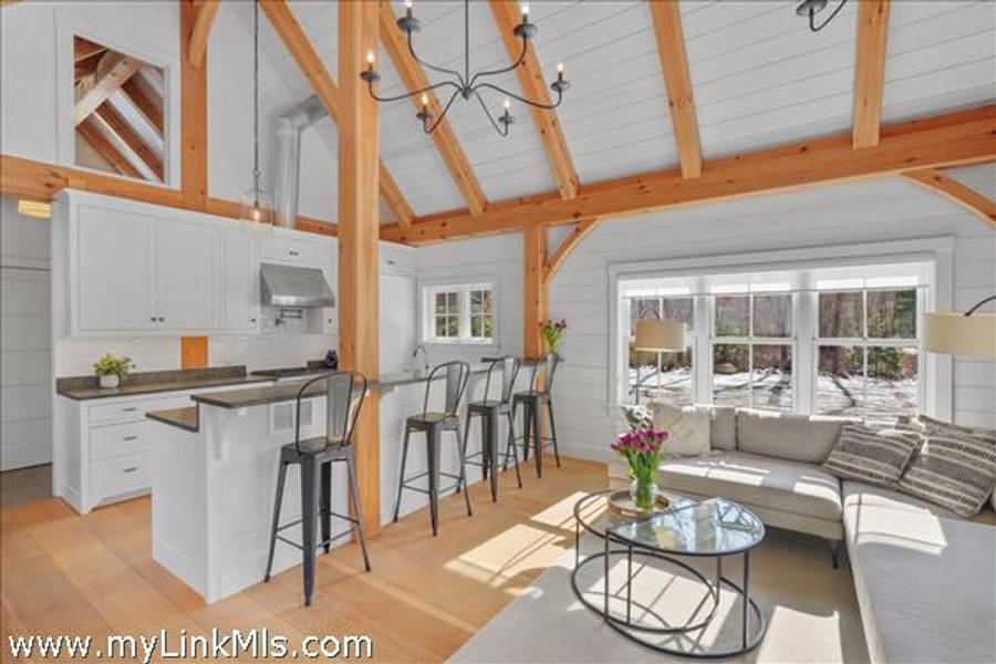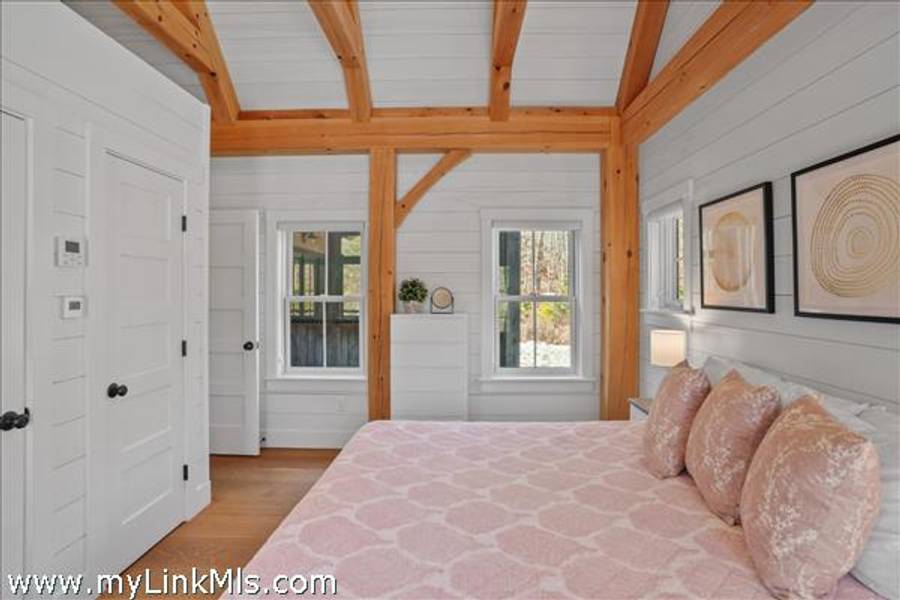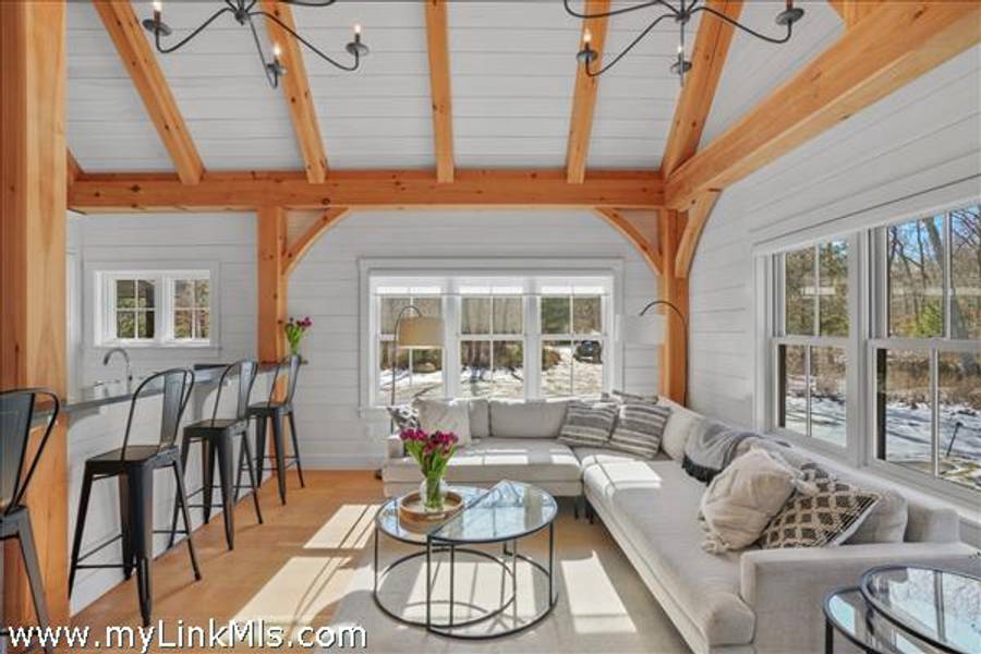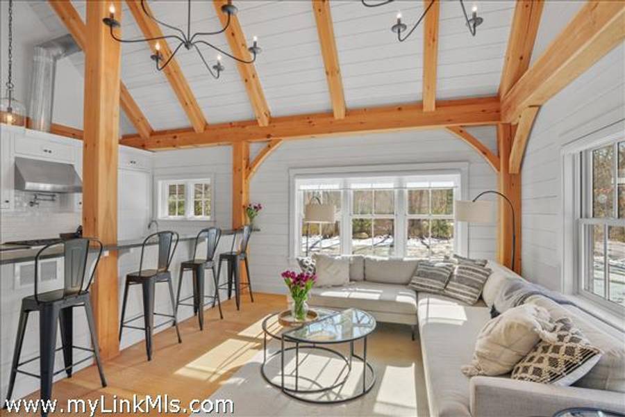 An existing guest house (2016) is adorned with beautiful beams throughout, with nickel-board and shiplap covering the walls and ceilings, providing an exquisite coastal feel. Currently, the estate features an approximately 942 sq ft high-end guest house with two luxurious bedrooms and a loft space. This guest house is equipped with all the modern conveniences and sophisticated features you could desire, ensuring comfort and style. Beautiful Kitchen- the kitchen is the heart of the home, designed with both aesthetics and functionality in mind. It includes: state-of-the-art appliances, including a Wolf stove, Miele dishwasher and fridge/freezer. The soapstone island countertop is situated in the middle of the kitchen and living room, making entertaining a breeze. Warm Living Room- the bright living room is designed to be the perfect spot for relaxation and family time. Features include: an open concept design that’s seamless integration with the kitchen and three season porch, creating an expansive, unified space perfect for entertaining and everyday living. The home has windows strategically placed to maximize natural light and provide stunning views of the outdoors, enhancing the homes’s warmth and openness. With the sunporch being directly off the living room, it makes for a delightful addition, offering a versatile space that can be enjoyed for three seasons. It is bathed in sunlight throughout the day, enhancing the overall brightness of the home and providing a peaceful retreat. The overall floor plan emphasizes openness and natural light, with each room flowing seamlessly into the next. The use of large windows and thoughtful design elements ensures that every part of the home feels connected to the outdoors, creating a harmonious living environment. By combining thoughtful design with practical living spaces, this main level floor plan offers comfort, beauty, and functionality, making it an ideal setting for both everyday living and entertaining.