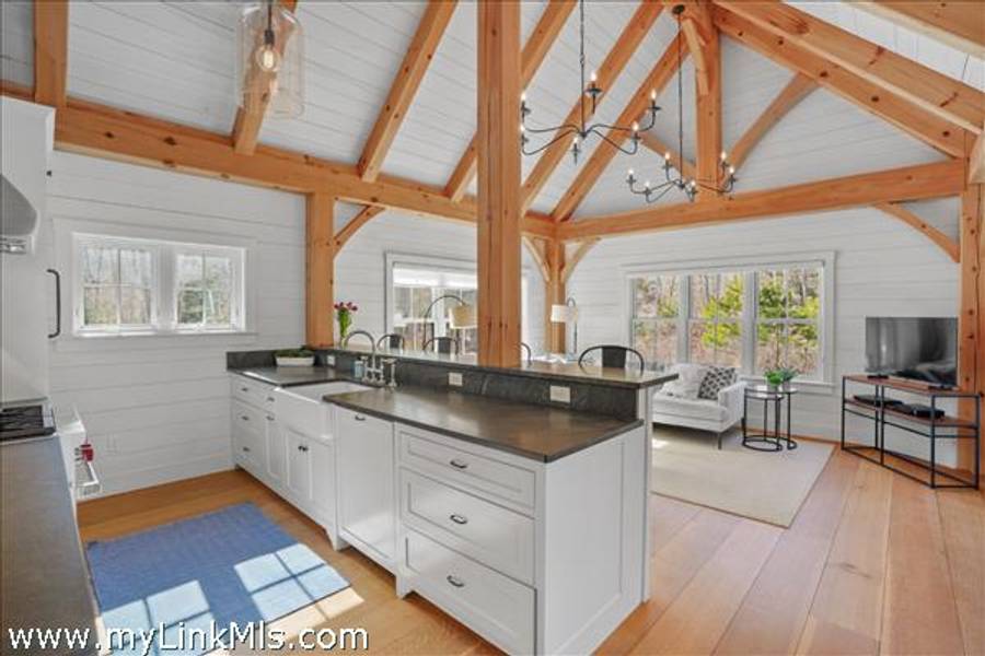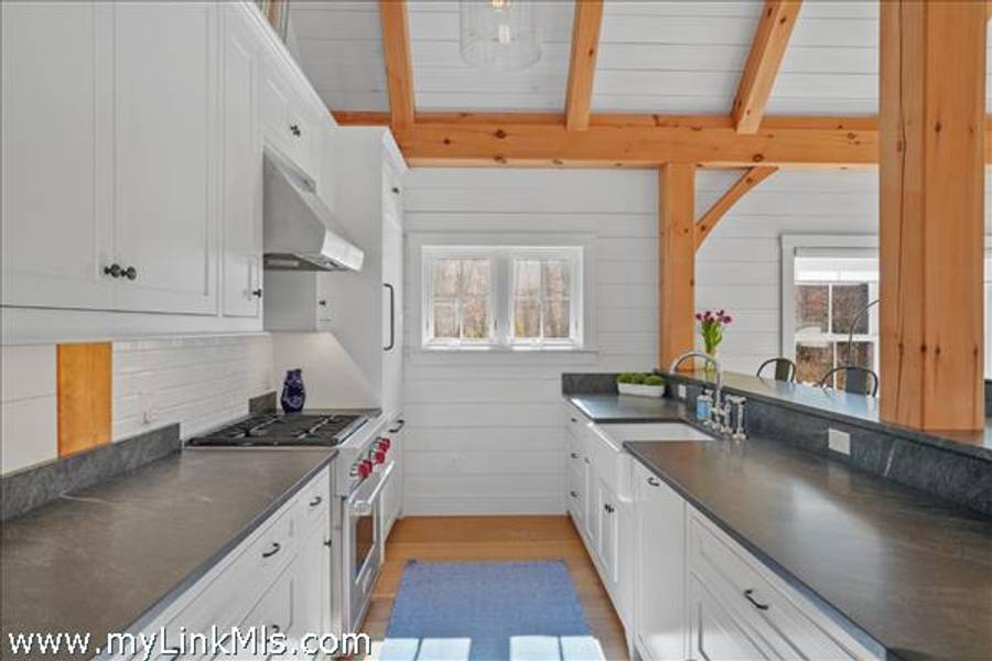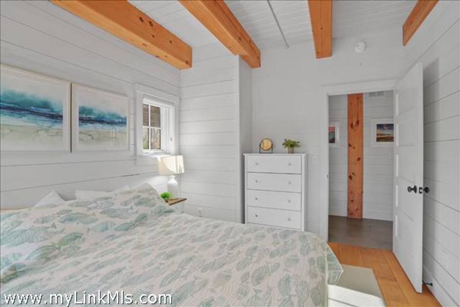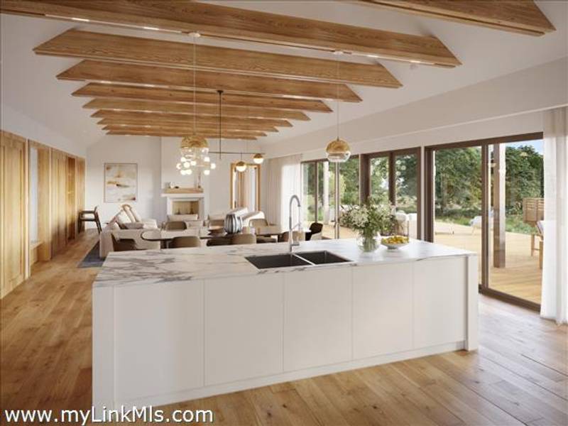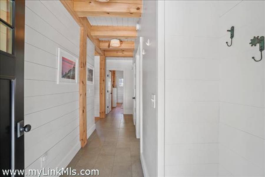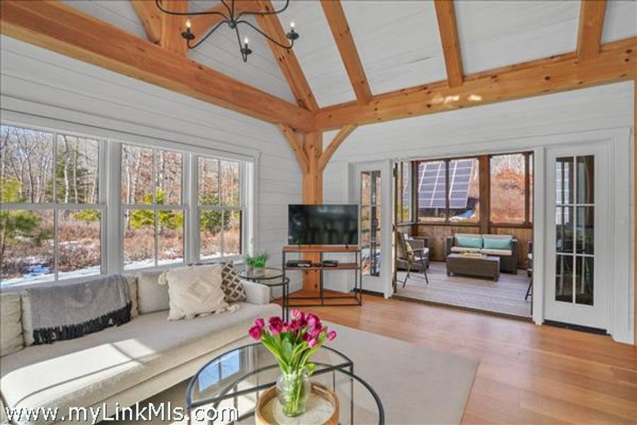 An existing guest house (2016) is adorned with beautiful beams throughout, with nickel-board and shiplap covering the walls and ceilings, providing an exquisite coastal feel. Currently, the estate features an approximately 942 sq ft high-end guest house with two luxurious bedrooms and a loft space. This guest house is equipped with all the modern conveniences and sophisticated features you could desire, ensuring comfort and style. Beautiful Kitchen- the kitchen is the heart of the home, designed with both aesthetics and functionality in mind. It includes: state-of-the-art appliances, including a Wolf stove, Miele dishwasher and fridge/freezer. The soapstone island countertop is situated in the middle of the kitchen and living room, making entertaining a breeze. Warm Living Room- the bright living room is designed to be the perfect spot for relaxation and family time. Features include: an open concept design that’s seamless integration with the kitchen and three season porch, creating an expansive, unified space perfect for entertaining and everyday living. The home has windows strategically placed to maximize natural light and provide stunning views of the outdoors, enhancing the homes’s warmth and openness. With the sunporch being directly off the living room, it makes for a delightful addition, offering a versatile space that can be enjoyed for three seasons. It is bathed in sunlight throughout the day, enhancing the overall brightness of the home and providing a peaceful retreat. The overall floor plan emphasizes openness and natural light, with each room flowing seamlessly into the next. The use of large windows and thoughtful design elements ensures that every part of the home feels connected to the outdoors, creating a harmonious living environment. By combining thoughtful design with practical living spaces, this main level floor plan offers comfort, beauty, and functionality, making it an ideal setting for both everyday living and entertaining.
