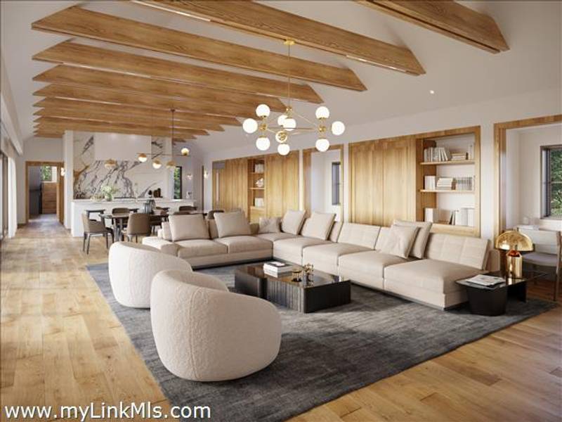 Step into this beautifully designed open-concept home featuring a modern kitchen outfitted with premium appliances, including a Wolf range and Sub-Zero refrigerator. The kitchen seamlessly flows into the spacious dining and living area with a 45-foot great room with soaring 16-foot vaulted ceilings, all adorned with elegant white oak flooring that adds warmth and sophistication throughout. Just off the kitchen, you'll find a private office—ideal for remote work, studying, or a quiet retreat.