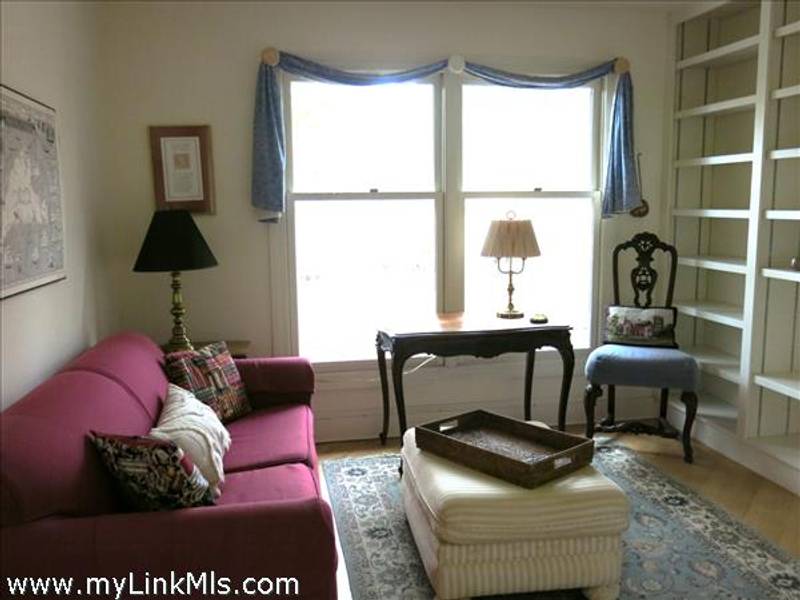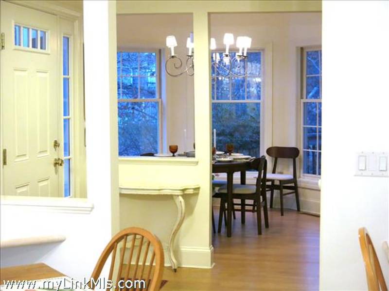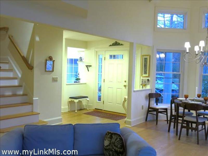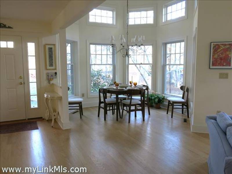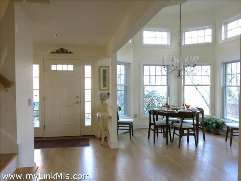 From the front door, entering through the foyer, the lovely living and dining spaces are on your left, with the ground floor bedroom/study beyond. To the right of the entry is the eat-in kitchen with the compact laundry room conveniently tucked in at the far end. The generous deck is accessed from the glass doors in the living room.