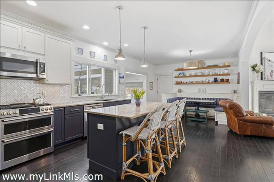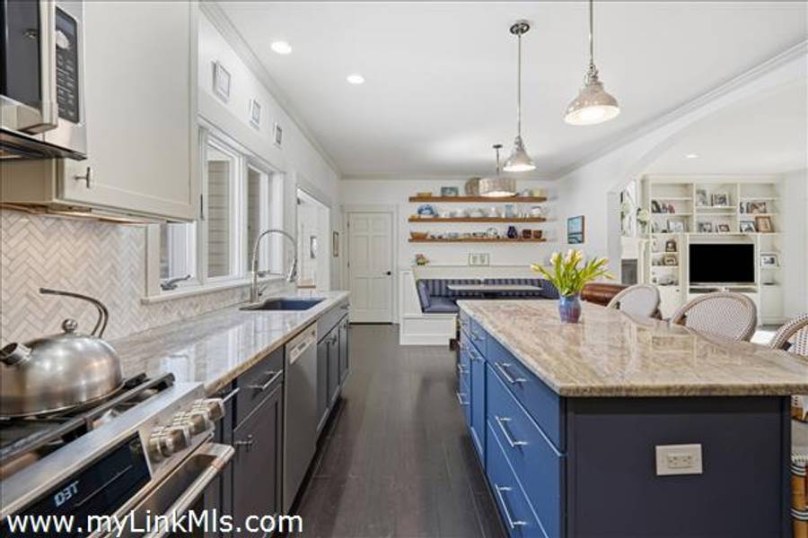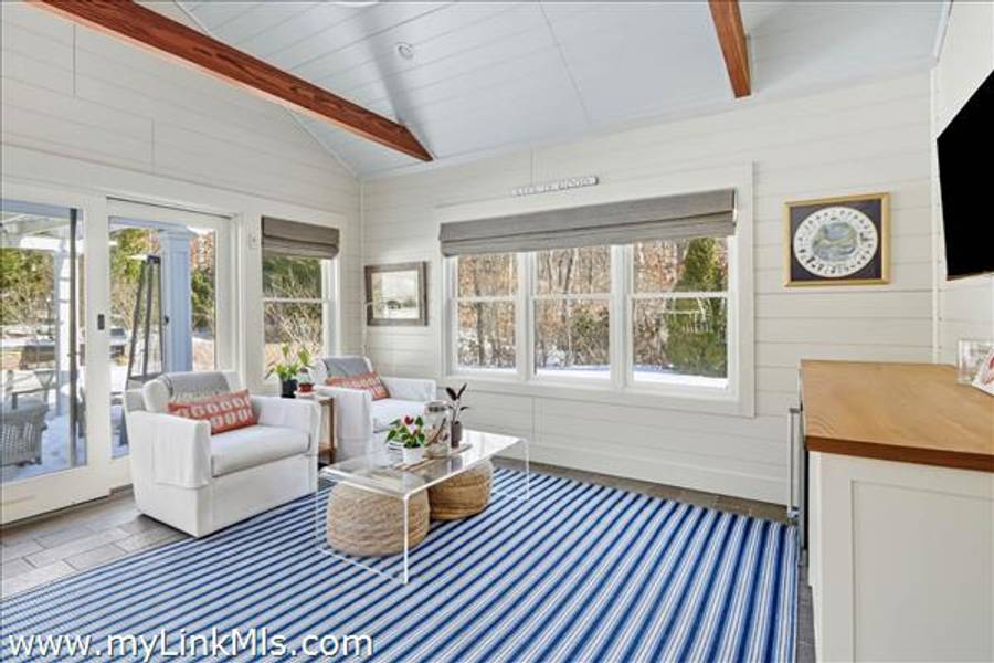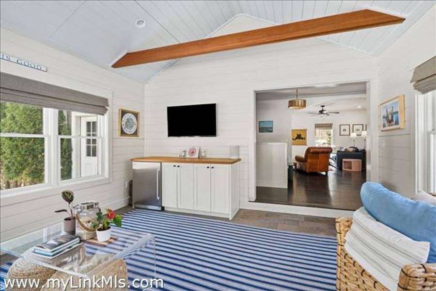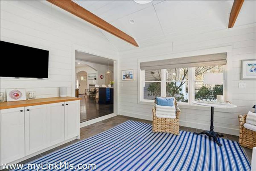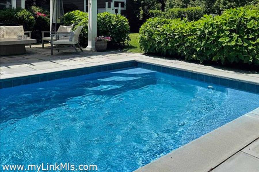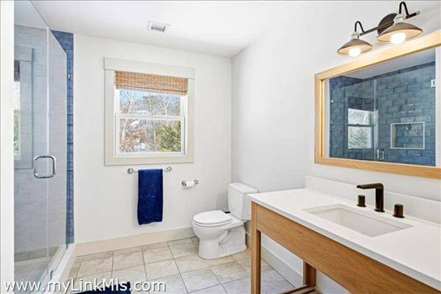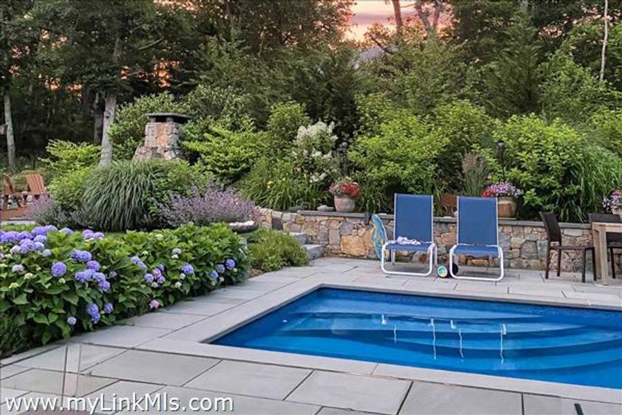 Built in 2016 by Squash Meadow Builders, this exceptional five-bedroom Colonial is ideally situated just moments from the sandy shores of Tashmoo Beach on Vineyard Sound. Thoughtfully designed across four levels of living, the home seamlessly blends timeless architecture with modern comfort. The main level offers an inviting open floor plan with a spacious living room with gas fireplace anchored by a gourmet kitchen with custom built-ins and charming bench seating. The kitchen blends effortlessly into a light-filled sunroom, creating the perfect setting for relaxed coastal living. A generous first floor primary suite provides privacy and convenience. The second level features bedroom suite with a private bath and three well-appointed guest bedrooms share a full bath with recently updated modern tile and vanity. The finished third level offers an expansive bunk room, ideal for extended family or guests. The finished lower level is designed for entertainment and wellness, featuring a media room, home gym, and ample storage. Indoor and outdoor living connect beautifully where the new sunroom opens to a pergola-covered stone patio overlooking a saltwater pool framed by a classic stone wall. The backyard is a private oasis, complete with an outdoor stone fireplace and lush landscaping accented by blue hydrangeas, perennials, and native sea grass. Additional highlights include a one-car garage and solar panels for energy efficiency. A turnkey Martha’s Vineyard retreat offering comfort, style, and effortless summer living near one of the island’s most beloved beaches.