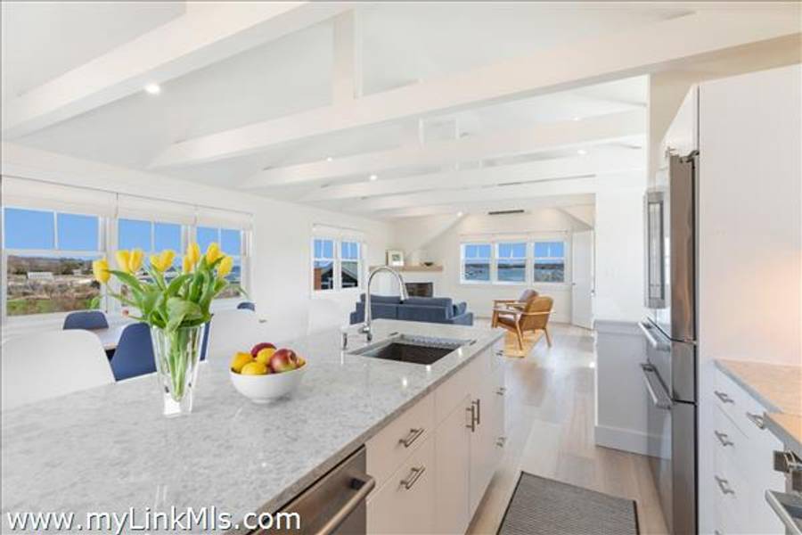 Waterview Condo in the Heart of Downtown Vineyard Haven. Experience the best of in-town living with this newly built, thoughtfully designed 2-bedroom condo offering beautiful harbor views and luxurious modern finishes. The first level welcomes you with a primary suite featuring a full bath with a tub/shower combination and direct access to a private deck complete with an outdoor shower—perfect after a day at the beach. Also on this level is a comfortable guest bedroom with peaks of the harbor, a stylish full tile bath with a glass-enclosed shower, a cozy living area, and washer/dryer for convenience. Upstairs, cathedral ceilings and a gas fireplace create an inviting open-concept living space. The gourmet kitchen is outfitted with sleek Bosch appliances, a large center island ideal for entertaining, and an adjoining dining area. Enjoy panoramic water views of the harbor, passing ferry boats, and Vineyard Sound from the entire second floor, or step out onto your private deck—perfect for alfresco dining or morning coffee. Just steps from your door, a private path leads to the association’s sandy harbor beach, where you can store your kayak or launch your boat. This condo also includes a dedicated parking space and an enclosed storage area under the house—ideal for bikes, beach gear, or seasonal items. With easy access to downtown shops, restaurants, ferry terminal, and local beaches, this condo offers the ultimate combination of luxury, convenience, and island charm. A rare opportunity for carefree coastal living on Martha’s Vineyard.