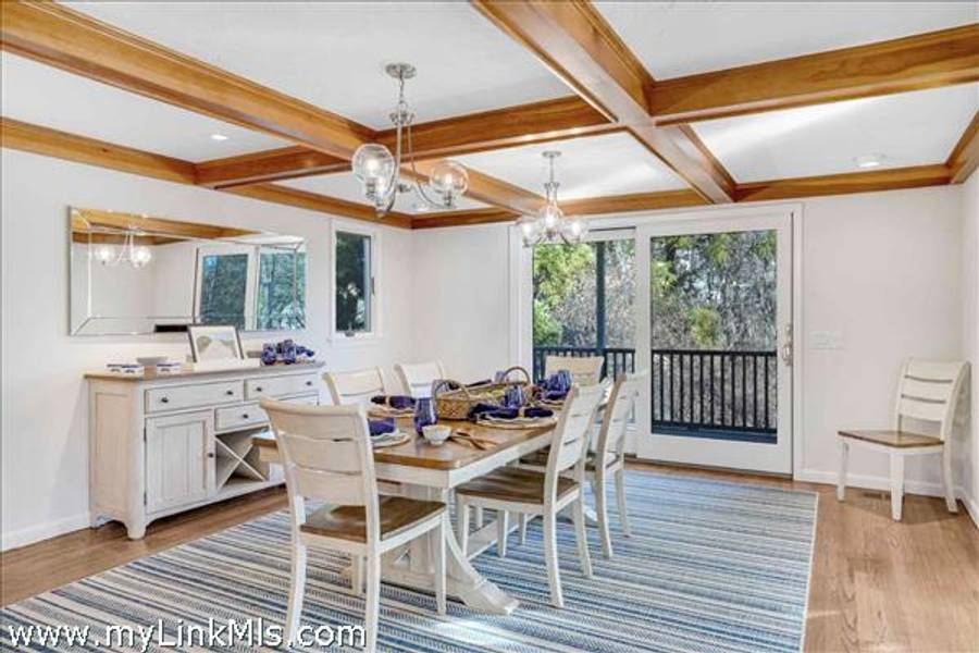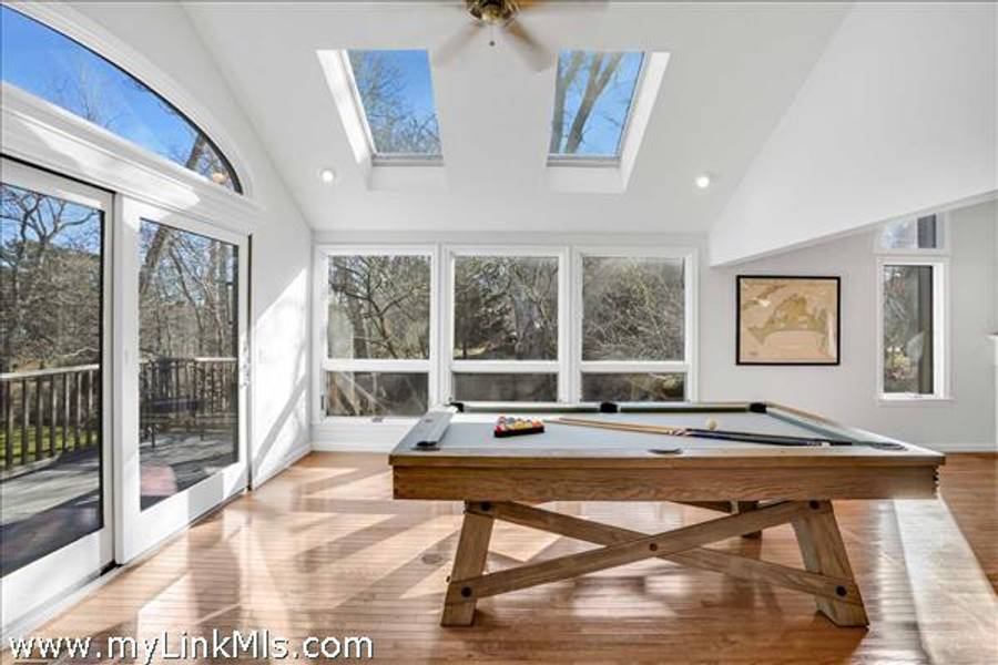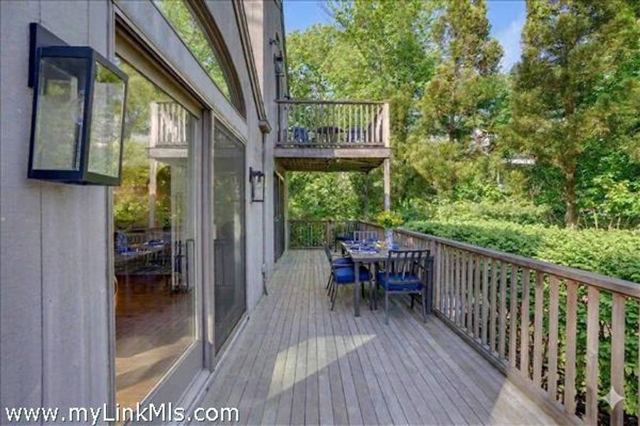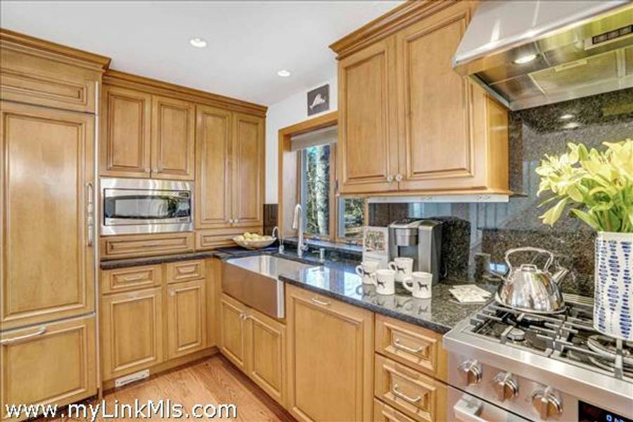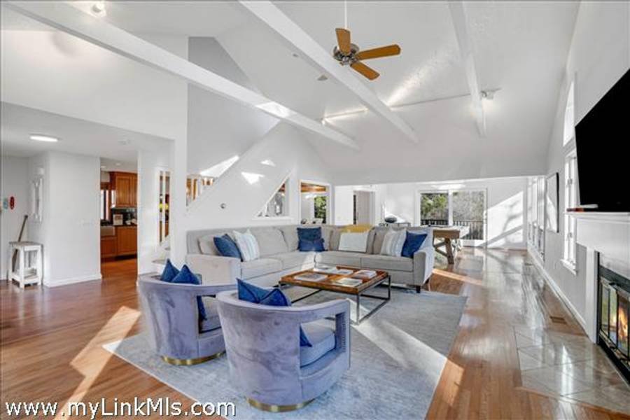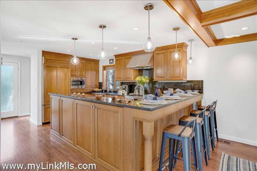 The main level welcomes you with a gracious living room featuring soaring wood-beamed ceilings, a maple wood-burning fireplace, and an abundance of natural light streaming through floor-to-ceiling windows, skylights, and glass doors that open to the deck. The adjoining chef’s kitchen is both elegant and functional, appointed with marble countertops and backsplash, custom cabinetry, and wood-paneled Dacor® appliances for a seamless, sophisticated look.