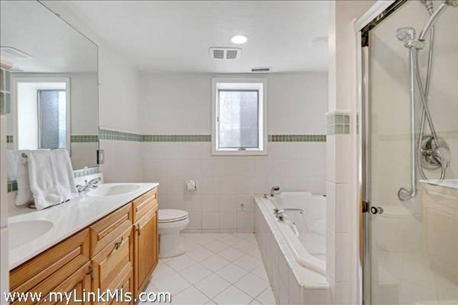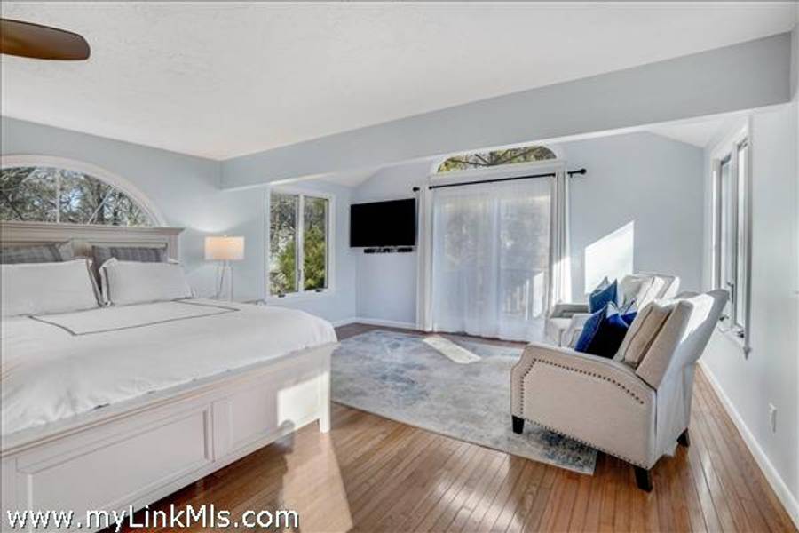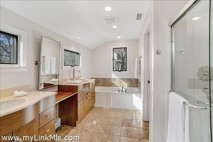 The entire upper level is devoted to a private primary suite, offering space for a sitting area and home office, access to a private balcony with pond views -- and a stylish en-suite bath with a deep soaking tub and separate glass-enclosed shower.