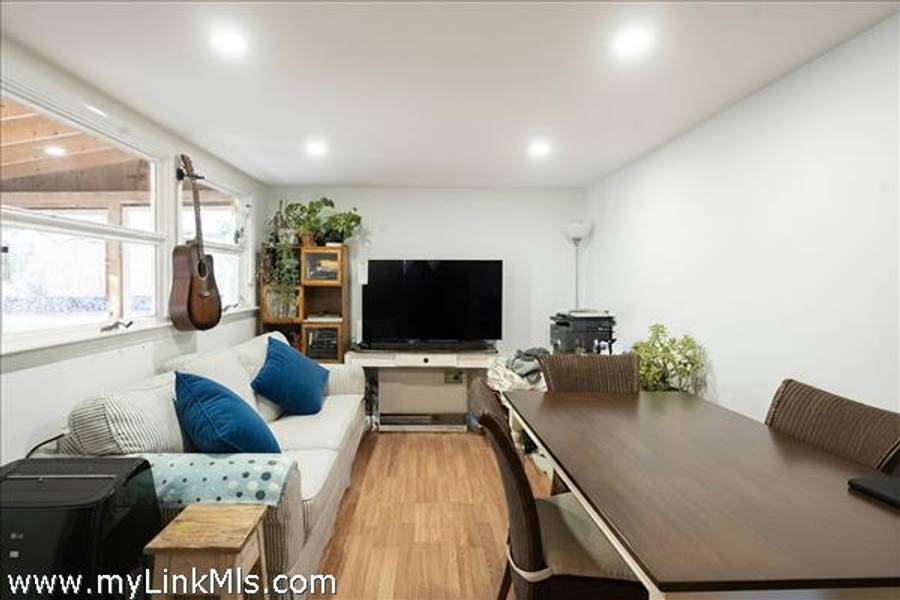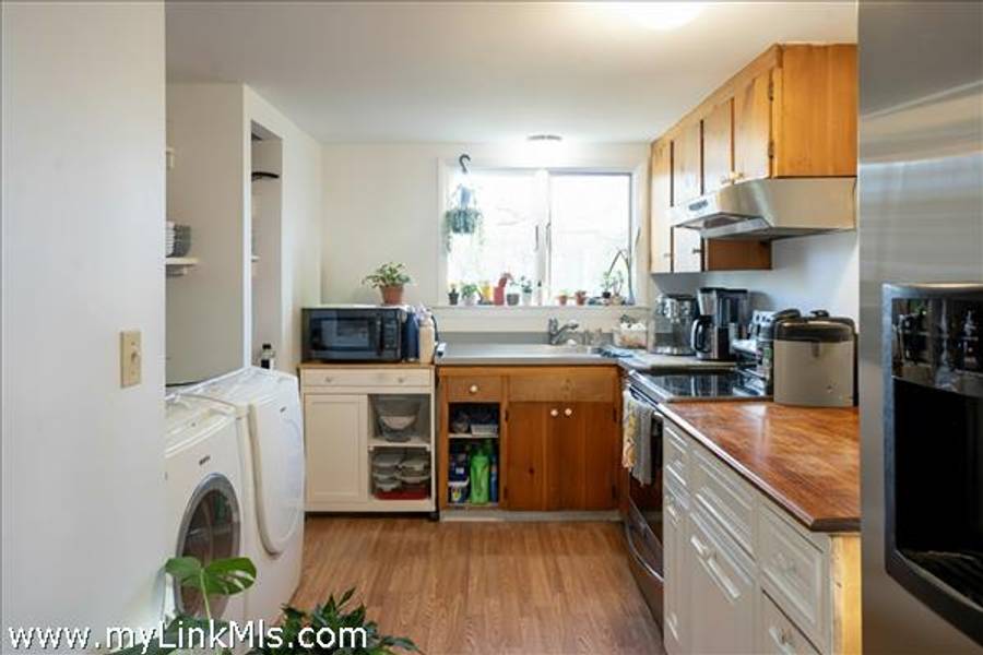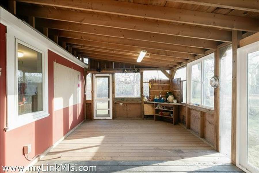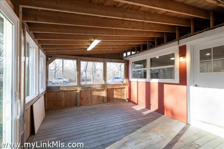 Three season porch connects to open floor plan with living and dining spaces, a laundry station and kitchen. A connecting hallway leads to a bath with shower and two bedrooms separate and privately sited on either end - see attached floor plan. A hatch to the attic is located in the hall ceiling.