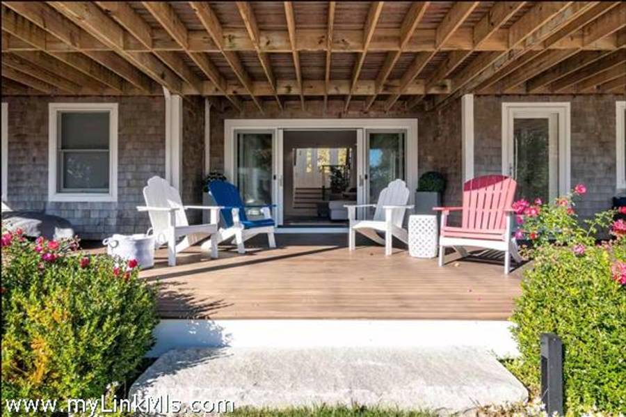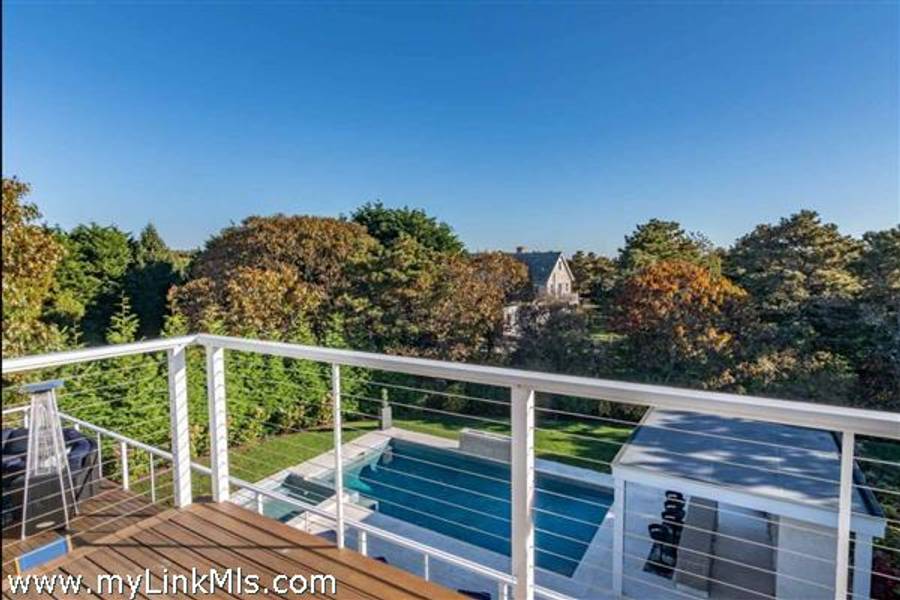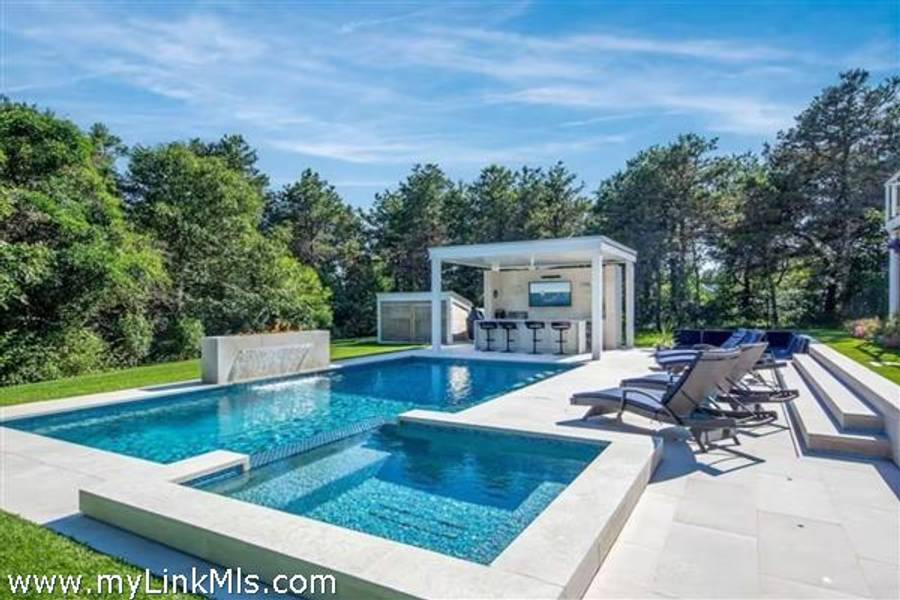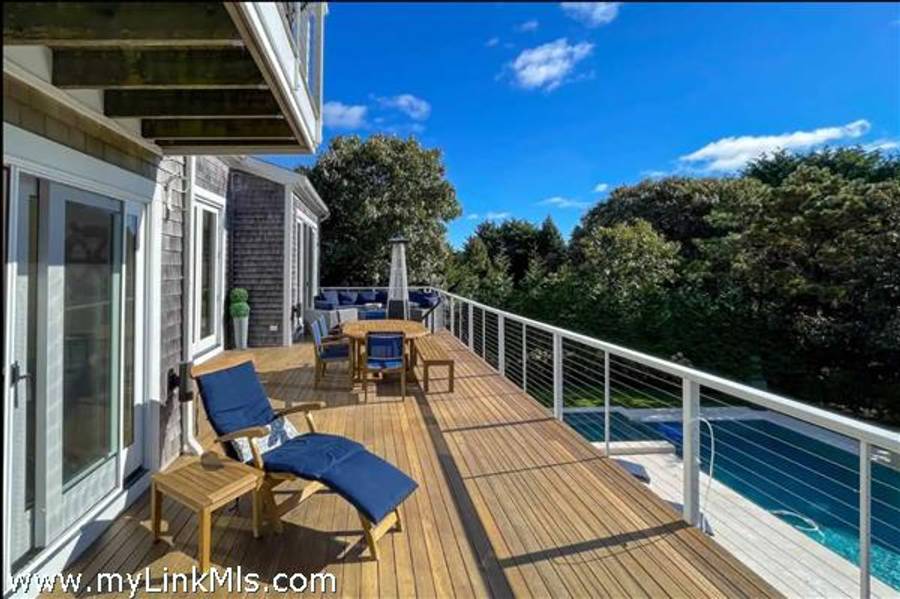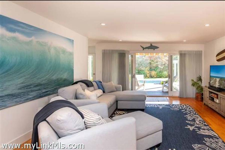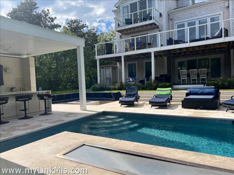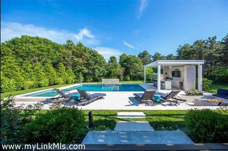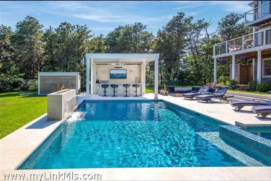KATAMA RD WITH EXTRAORDINARY POOL + OUTDOOR AREA. Nestled in the heart of Katama, this stunning four-level home is thoughtfully designed for the ultimate indoor-outdoor living experience. As you step into the dramatic Living Room, you'll be greeted by vaulted ceilings, a sleek tiled linear fireplace, and a full wall of 12-foot glass doors that seamlessly open out to an expansive mahogany deck, complete with comfortable lounging and dining furniture. The open-concept Dining Room and gourmet cook's Kitchen are perfect for both intimate family meals and entertaining guests, also with a full wall of glass doors that provide a seamless transition between indoor and outdoor living. An open staircase with cable railing leads to the luxurious Owner's Suite, featuring an outdoor balcony, two walk-in closets, and a spa-like bath complete with vanity, soaking tub, and a walk-in glass shower. Descending to the lower level, you'll find a spacious TV/Family Room that opens directly out to the outdoor pool area. Additionally, two bedrooms, a full bath, and convenient laundry facilities complete this level. The outdoor living spaces are truly extraordinary, boasting a captivating gunite pool with a built-in whirlpool spa and a mesmerizing waterfall with a striking fire feature. An outdoor cabana with bar seating, two beverage refrigerators, and a 76" water-resistant TV wall offers the perfect setting for outdoor entertainment. To top it off, a sunken conversation area with a fire-pit provides the ideal spot for gathering and relaxation. This idyllic beach house has been meticulously maintained,,it is being offered with all furnishings and contents* for a TURNKEY move-in or rental-ready property for Summer 2026!