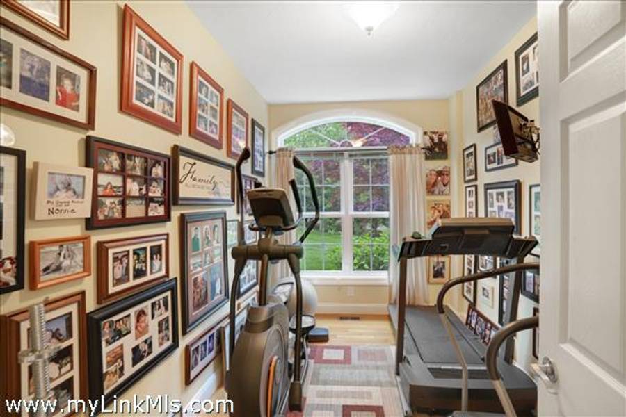 The first floor features a spacious living room, a dedicated office, a gym, a chef’s kitchen with a breakfast nook, a formal dining room, a half bathroom, and a mudroom.
