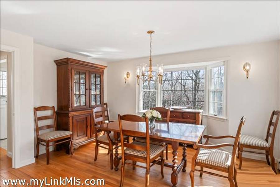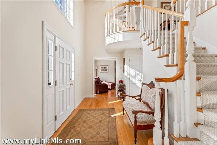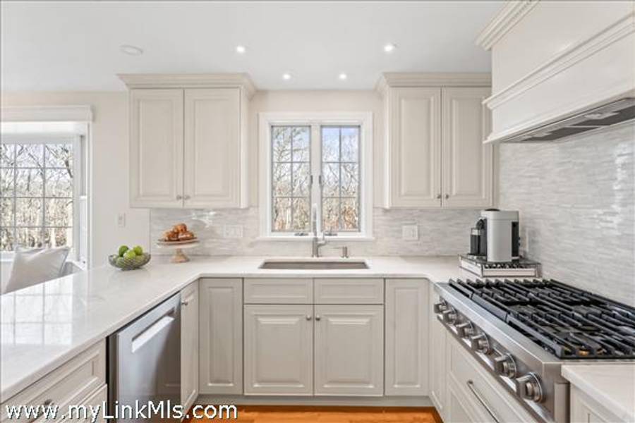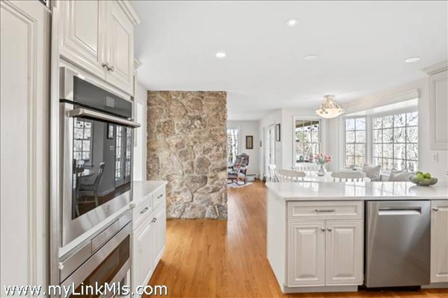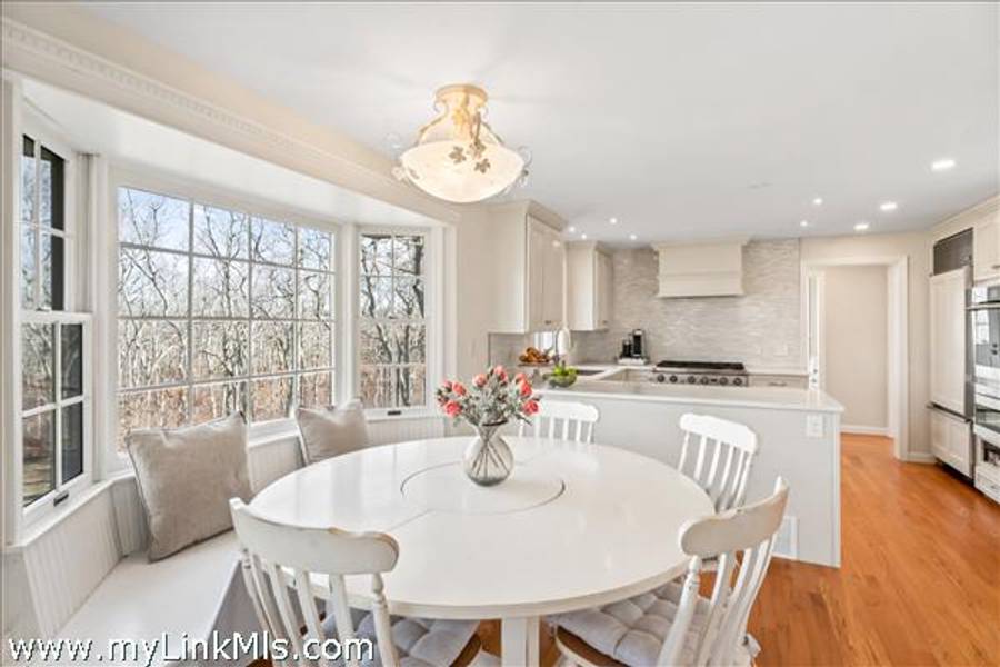 Grand foyer, living room with bay windows, stone fireplace, and french doors to balcony. Custom window seat banquette for casual dining opens to the kitchen with quartzite counters, natural stone mosaic backsplash, Sub-Zero panel refrigerator, Dacor gas stovetop, Sharp Microwave Drawer, Electrolux Wall Oven. Formal Dining Room with bay window. Powder room, mud room with tile floor, custom cabinetry, full size washer & dryer plus a convenient side entrance.
